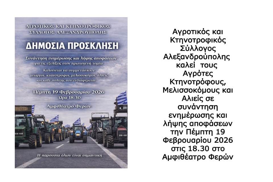 Ειδήσεις Συνάντηση ενημέρωσης και αποφάσεων από τον Αγροτικό και Κτηνοτροφικό Σύλλογο Αλεξανδρούπολης στις Φέρες