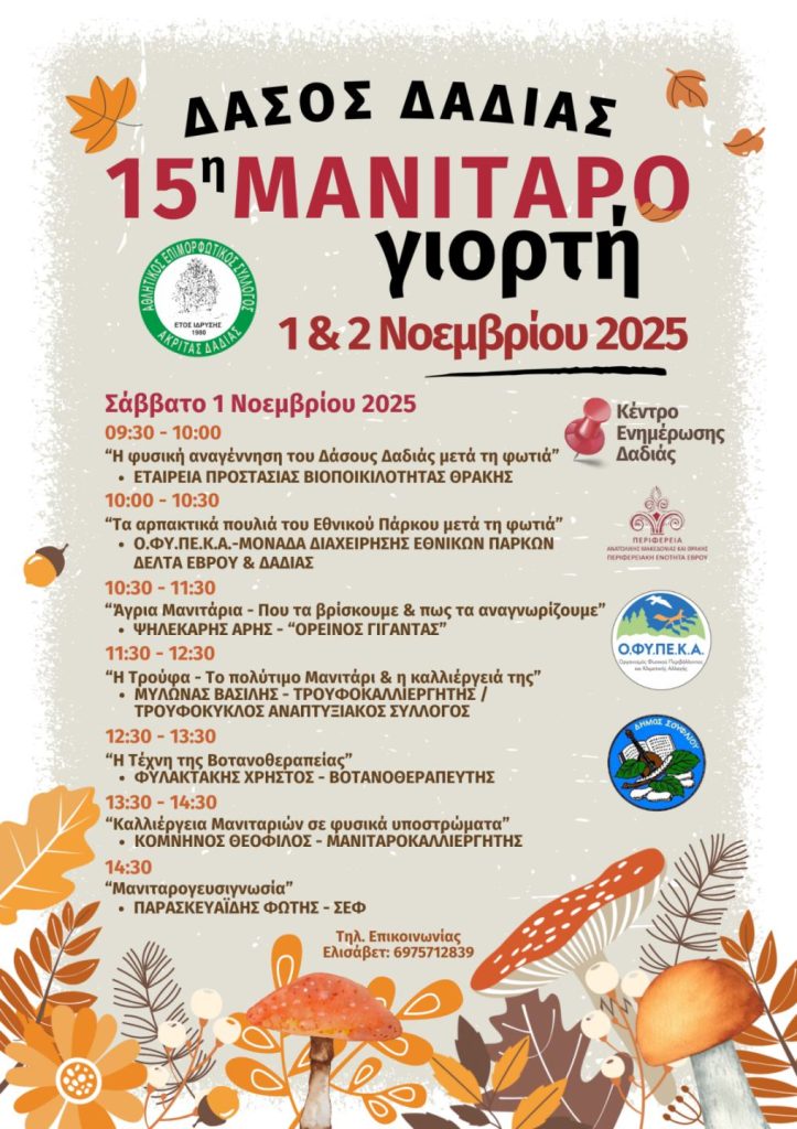 Το ραντεβού δίνεται ξανά στο μαγευτικό Δάσος της Δαδιάς. Το Σαββατοκύριακο 1 και 2 Νοεμβρίου 2025, μικροί και μεγάλοι φίλοι της φύσης, των μανιταριών και της γαστρονομίας ετοιμάζονται να βουτήξουν στον παραμυθένιο κόσμο της 15ης Γιορτής Μανιταριών, μιας εκδήλωσης που έχει εξελιχθεί σε θεσμό για την περιοχή και προσελκύει κάθε χρόνο πλήθος επισκεπτών απ’ όλη την Ελλάδα.