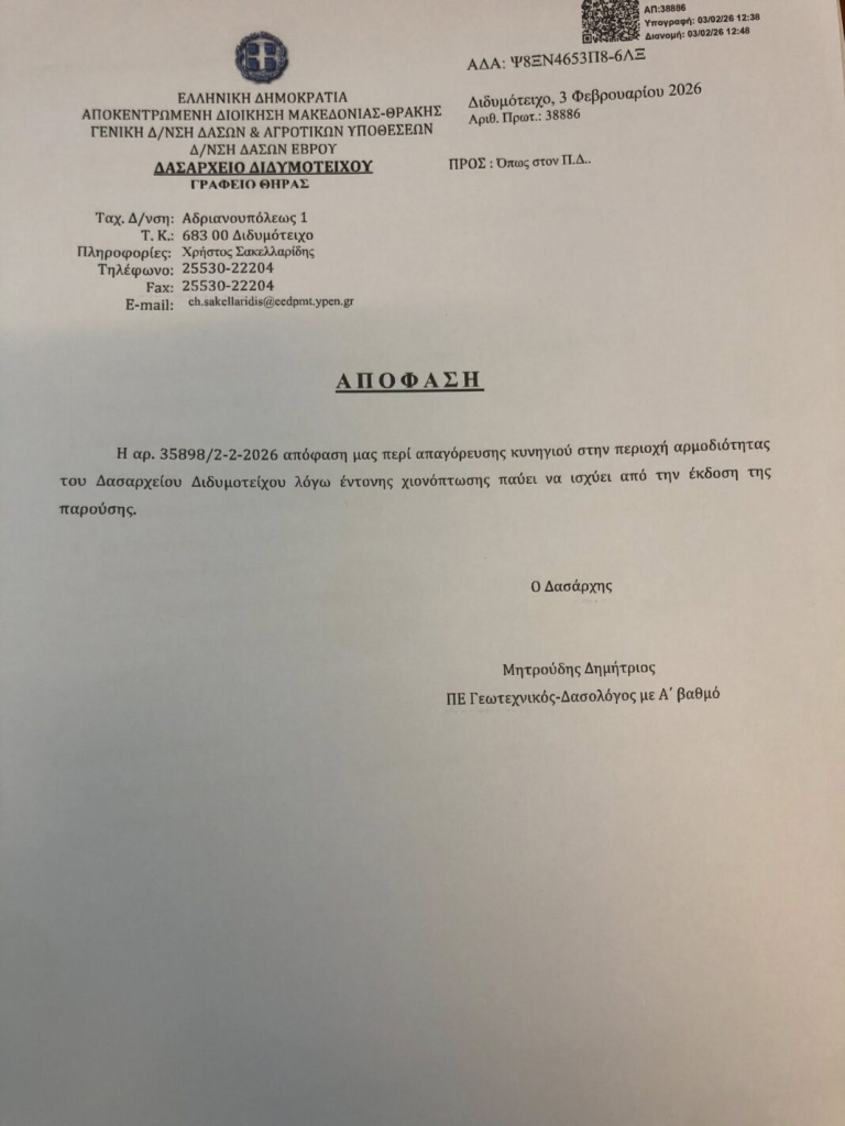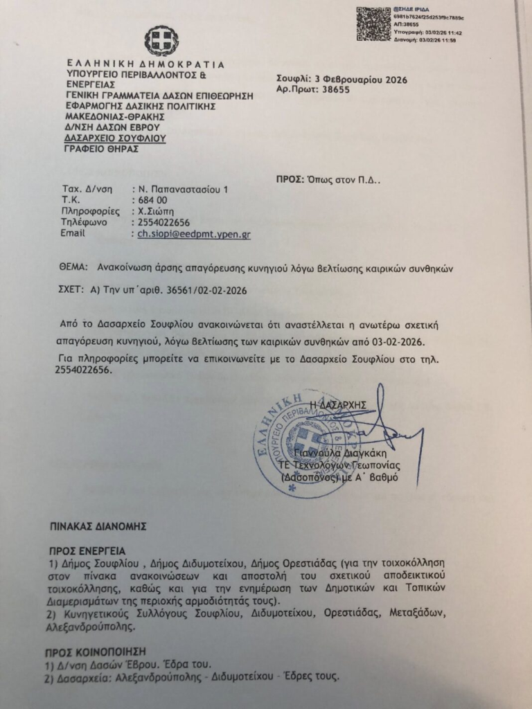 Την άρση της προσωρινής απαγόρευσης θήρας ανακοίνωσαν το Δασαρχείο Σουφλίου και το Δασαρχείο Διδυμοτείχου, μετά τη βελτίωση των καιρικών συνθηκών που επικρατούν στην περιοχή.