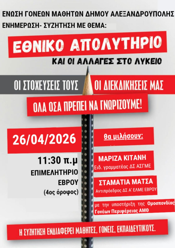 Εκδήλωση – συζήτηση με θέμα το Εθνικό Απολυτήριο και τις προωθούμενες αλλαγές στο Λύκειο διοργανώνει η Ένωση Συλλόγων Γονέων του Δήμου Αλεξανδρούπολης.