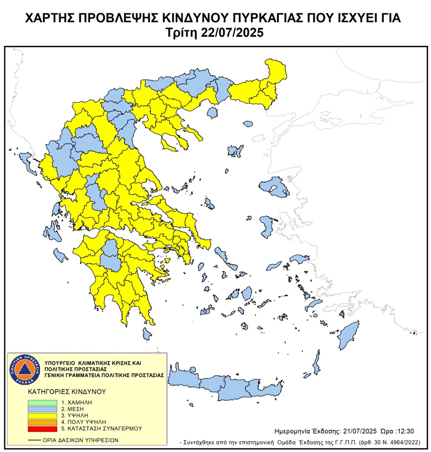 Για την Τρίτη 22-07-2025 ο Χάρτης Πρόβλεψης Κινδύνου Πυρκαγιάς της Γενικής Γραμματείας Πολιτικής Προστασίας, προβλέπει υψηλό κίνδυνο πυρκαγιάς, κατηγορίας κινδύνου 3 για τις περιοχές των Δασαρχείων Αλεξανδρούπολης, Διδυμοτείχου και Σουφλίου. Για το λόγο αυτό τίθεται σε ισχύ η υπ αριθ.135789/1279/24-04-2025 απόφαση του Αντιπεριφερειάρχη Έβρου, σύμφωνα με την οποία απαγορεύεται η διέλευση, η παραμονή και η κυκλοφορία προσώπων και οχημάτων, από τις 8:00 το πρωί έως τις 22:00 το βράδυ της Τρίτης 22-07-2025, στις παρακάτω δασικές περιοχές ανά Δασαρχείο: