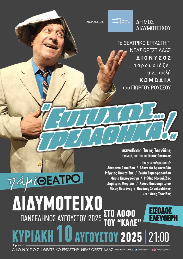 Η εκδήλωση θα ανοίξει με τη θεατρική παράσταση «Ευτυχώς τρελάθηκα!», μια εξαιρετική κωμωδία του Γιώργου Ρούσσου, την οποία θα παρουσιάσει το Θεατρικό Εργαστήρι Νέας Ορεστιάδας ΔΙΟΝΥΣΟΣ. Η σκηνή θα πλημμυρίσει από ερμηνείες και ζωντάνια, δίνοντας το έναυσμα για μια βραδιά που θα μείνει στη μνήμη.