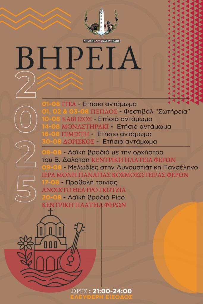 Αύγουστος στον Δήμο Αλεξανδρούπολης σημαίνει… ΒΗΡΕΙΑ 2025! Γιορτές, αντάμωματα και μουσικές βραδιές σε όλη την περιοχή!