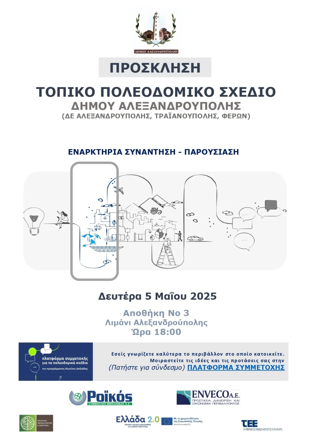 Ειδήσεις Ανοικτή πρόσκληση στην παρουσίαση της μελέτης «Τοπικό Πολεοδομικό Σχέδιο Δήμου Αλεξανδρούπολης» 24/04/2025