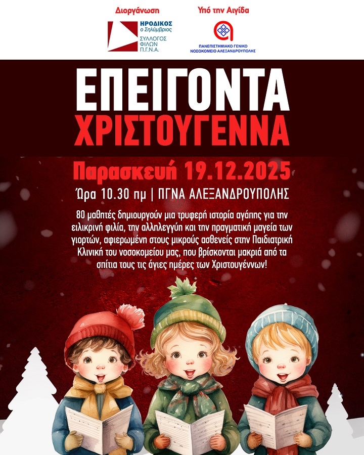 Ειδήσεις «Επείγοντα Χριστούγεννα!» στο ΠΓΝΑ Αλεξανδρούπολης – Μαθητές «ντύνουν» με ευχές την Παιδιατρική Κλινική 19/12/2025