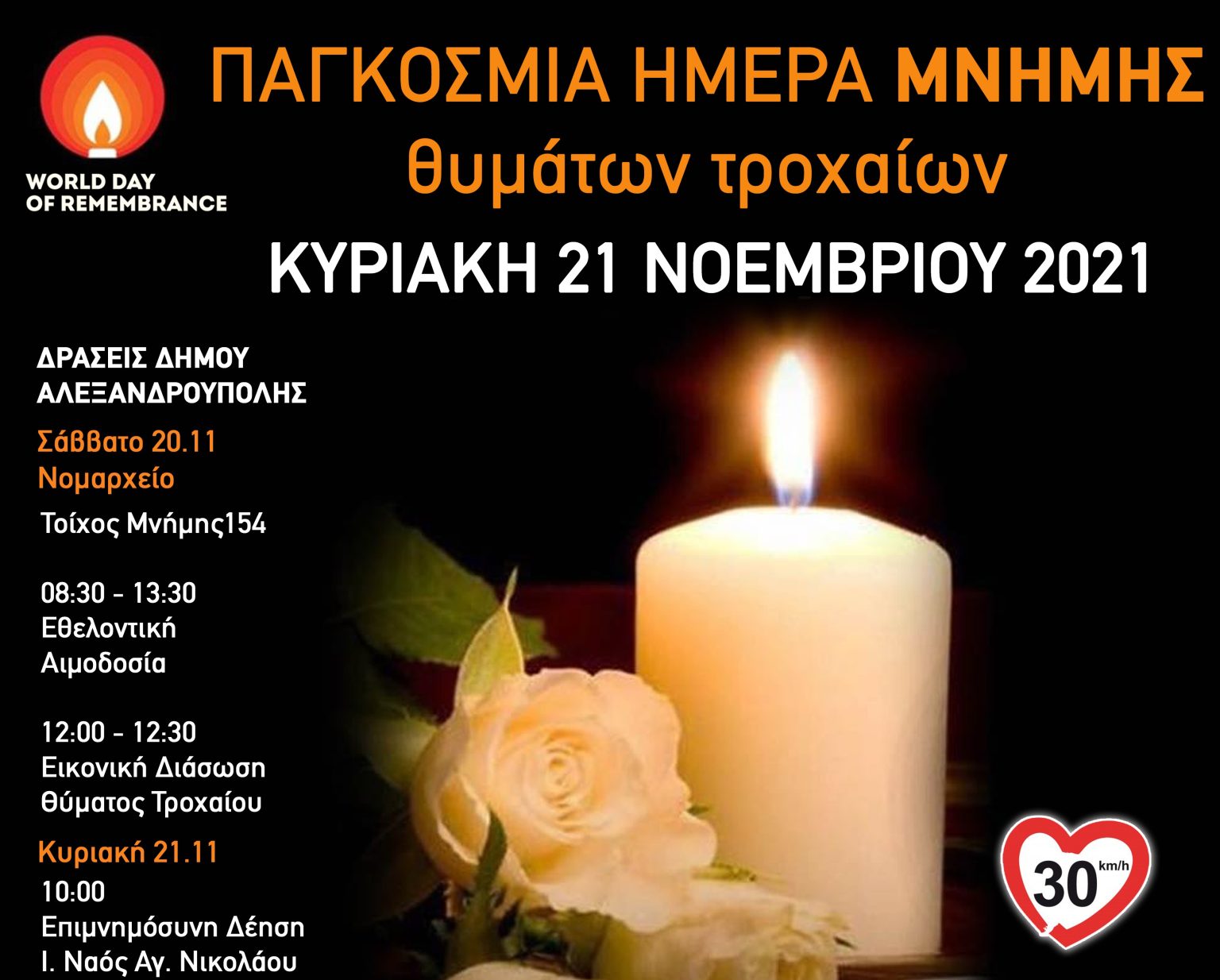Ενδιαφέρουν Δράσεις για την Παγκόσμια Ημέρα Μνήμης Θυμάτων Τροχαίων, Κυριακή 21 Νοεμβρίου 2021 στην Αλεξανδρούπολη 16/11/2021