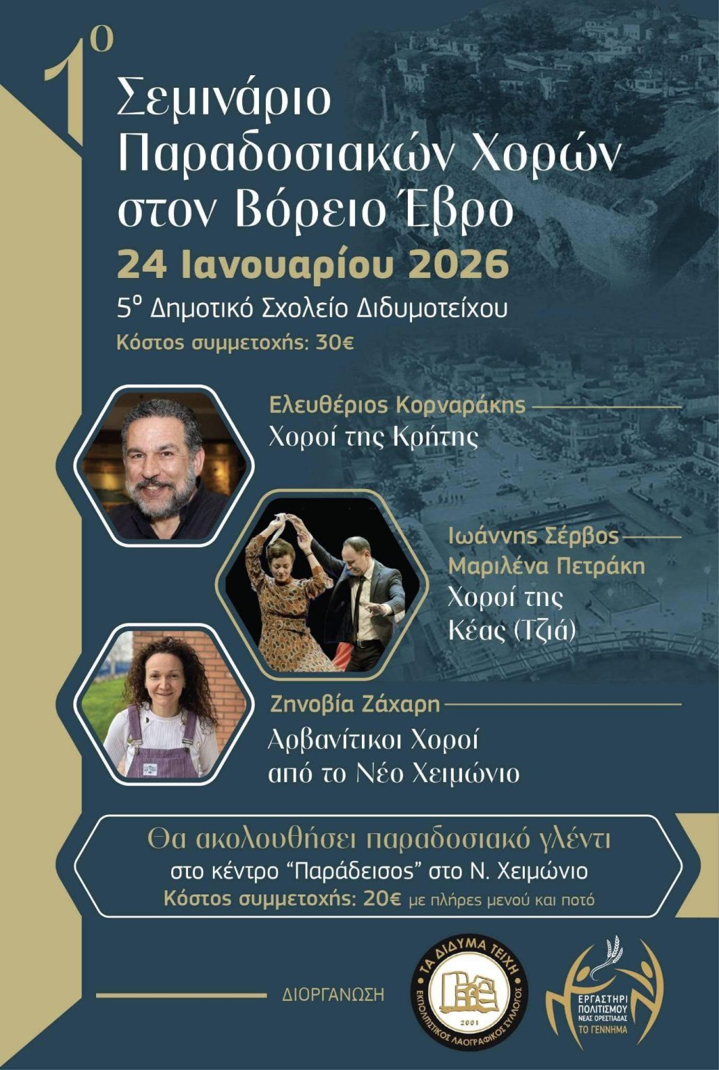 Πολιτισμός 1ο Σεμινάριο Παραδοσιακών Χορών στον Βόρειο Έβρο: Μια γέφυρα πολιτισμών από την Κρήτη έως την Τζια και τον ντόπιο αρβανίτικο χορό 27/11/2025