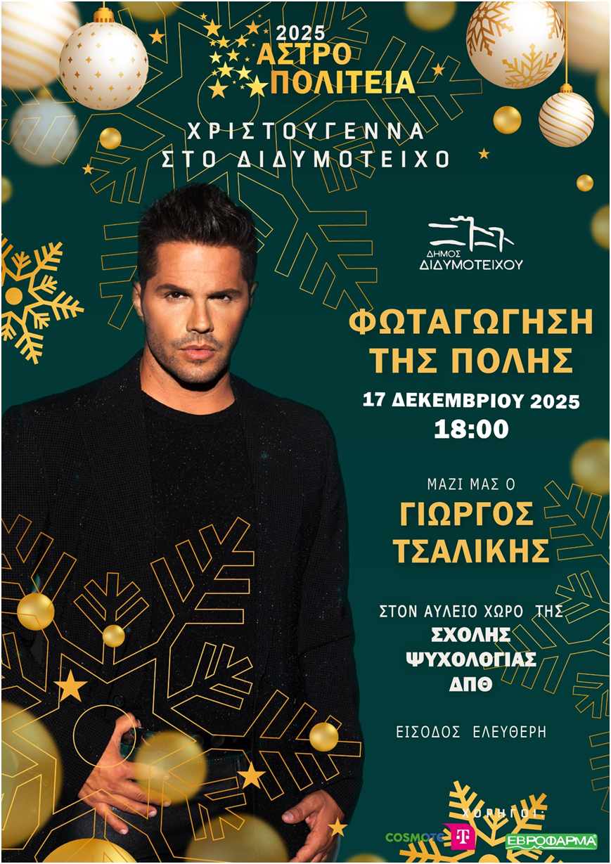 Πολιτισμός Φωταγώγηση Χριστουγεννιάτικου Δέντρου και Συναυλία με Γιώργο Τσαλίκη στο Διδυμότειχο 04/12/2025