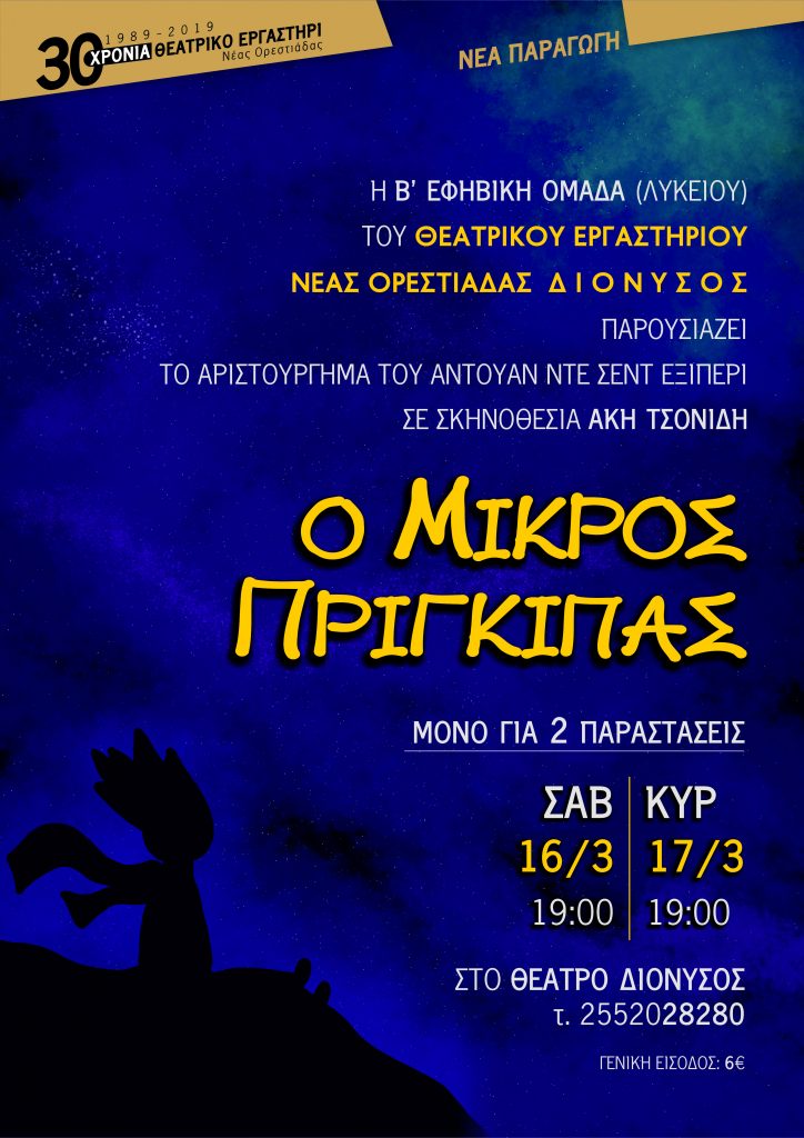 Πολιτισμός Παραστάσεις από την Β΄ Εφηβική Ομάδα του Θεατρικού Εργαστηρίου Νέας Ορεστιάδας ΔΙΟΝΥΣΟΣ με το έρο «Μικρός Πρίγκιπας» 15/03/2019