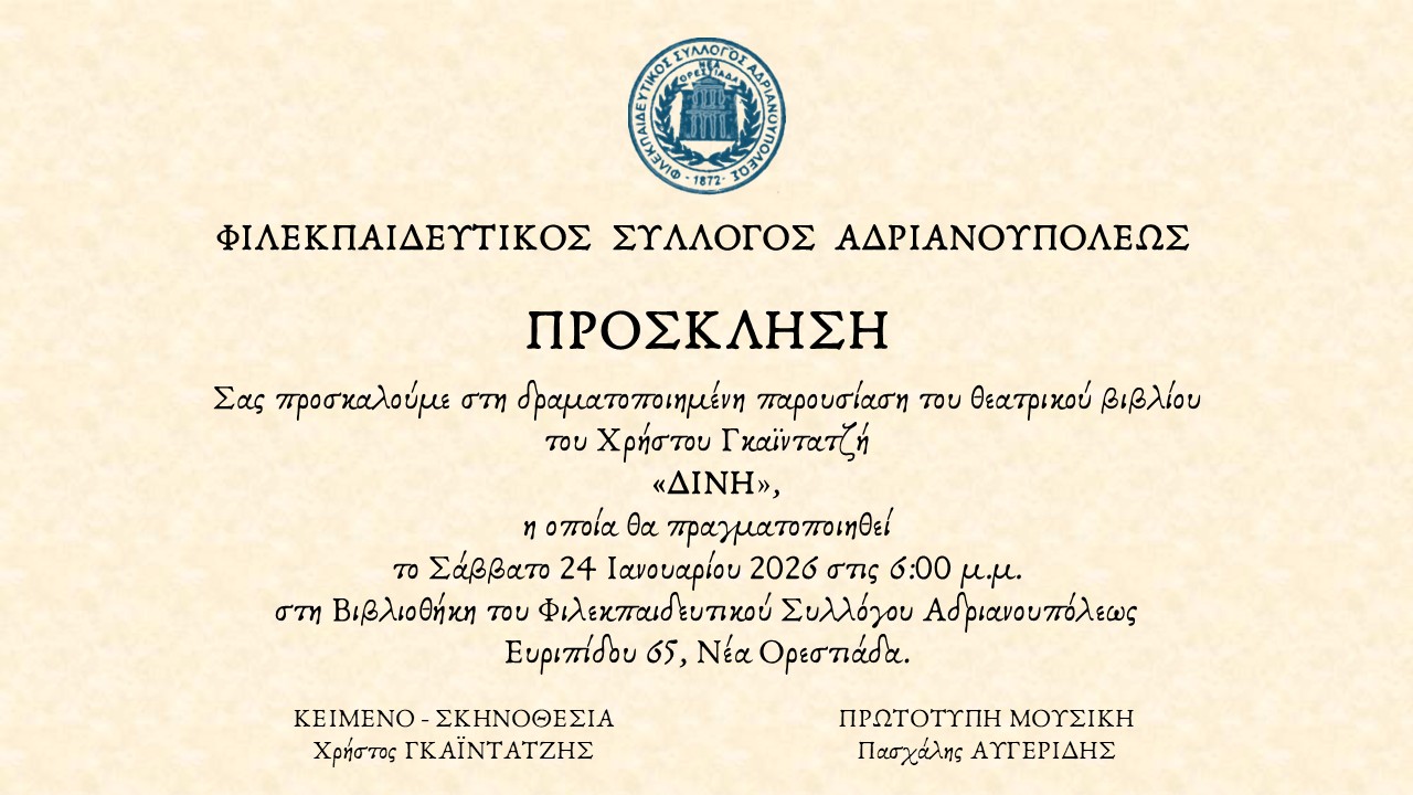 Πολιτισμός «Δίνη»: Θεατρική εμπειρία λόγου και μουσικής από τον Φιλεκπαιδευτικό Σύλλογο Αδριανούπολης 22/01/2026