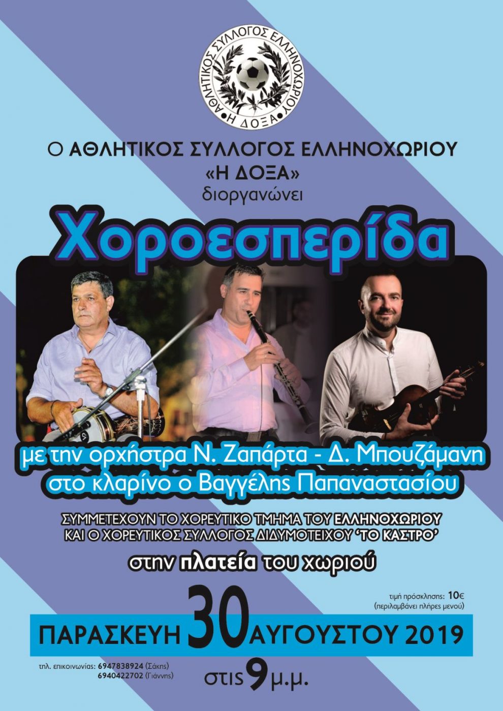 Ο Αθλητικός Σύλλογος Ελληνοχωρίου “Η ΔΟΞΑ” σας προσκαλεί στην χοροεσπερίδα που διοργανώνει την Παρασκευή 30 Αυγούστου και ώρα έναρξης 09:00 μ.μ. στην πλατεία του χωριού. Θα μας διασκέδαση η ορχήστρα του Ν. Ζαπάρτα – Δ. Μπουζαμάνη και στο κλαρίνο θα είναι ο Βαγγέλης Παπαναστασίου. Θα συμμετέχουν το χορευτικό τμήμα Ελληνοχωρίου καθώς και ο χορευτικός σύλλογος Διδυμοτείχου “ΤΟ ΚΑΣΤΡΟ”. Σας περιμένουμε όλους για πολύ κέφι, ποτό και πολλά δώρα!!