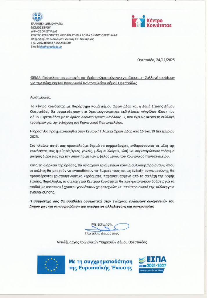 Με το μήνυμα της προσφοράς να γίνεται πιο επίκαιρο από ποτέ την περίοδο των γιορτών, το Κοινωνικό Παντοπωλείο του Δήμου Ορεστιάδας απευθύνει ανοιχτή πρόσκληση στους πολίτες να συμμετάσχουν στη δράση «Χριστούγεννα για όλους…». Η πρωτοβουλία θα πραγματοποιηθεί από τις 15 έως τις 19 Δεκεμβρίου στην Κεντρική Πλατεία της πόλης και αποσκοπεί στην ενίσχυση των συμπολιτών που βρίσκονται σε ανάγκη.