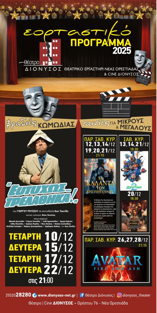 Με θέατρο και κινηματογράφο στη Νέα Ορεστιάδα, το Θέατρο ΔΙΟΝΥΣΟΣ καλεί μικρούς και μεγάλους στο εορταστικό πρόγραμμα που ετοίμασε το Θεατρικό Εργαστήρι Νέας Ορεστιάδας ΔΙΟΝΥΣΟΣ και οι cine-συνεργάτες του. Από την Τετάρτη 10 έως και την Κυριακή 28 Δεκεμβρίου ο ΔΙΟΝΥΣΟΣ συνεχίζει να δίνει τη δυνατότητα για ψυχαγωγία και διασκέδαση και κατά τη διάρκεια της εορταστικής περιόδου όπως κάθε χρόνο∙ πλέον στον ανανεωμένο χώρο του, καθώς μετά από παρεμβάσεις στην πλατεία οι σειρές των καθισμάτων έχουν αραιώσει, προσφέροντας στους θεατές ακόμη περισσότερη άνεση και ευρυχωρία.