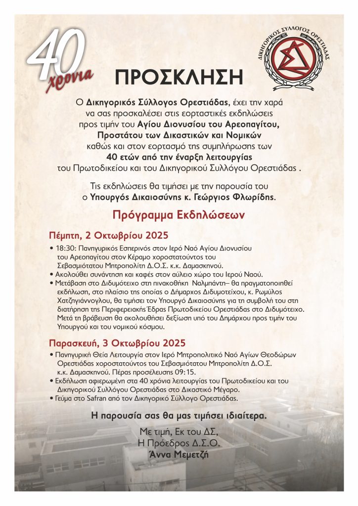 Με ιδιαίτερη λαμπρότητα και επίσημο χαρακτήρα, ο Δικηγορικός Σύλλογος Ορεστιάδας προχωρά σε μια σειρά εκδηλώσεων, με αφορμή τη διπλή γιορτή: αφενός την τιμή στον Άγιο Διονύσιο τον Αρεοπαγίτη, προστάτη των Δικαστικών και Νομικών, και αφετέρου τη συμπλήρωση 40 χρόνων από την ίδρυση και λειτουργία του Πρωτοδικείου και του ίδιου του Συλλόγου.