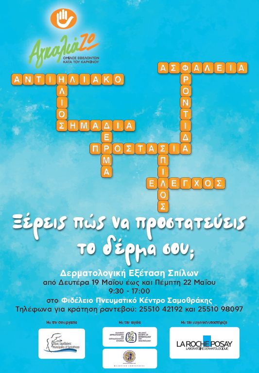 Ο Δήμος Σαμοθράκης σε συνεργασία με τον Όμιλο Εθελοντών κατά του Καρκίνου ΑγκαλιάΖΩ θα πραγματοποιήσει δωρεάν ιατρικές δερματολογικές εξετάσεις σπίλων από τη Δευτέρα 19 Μαΐου έως και την Πέμπτη 22 Μαΐου.