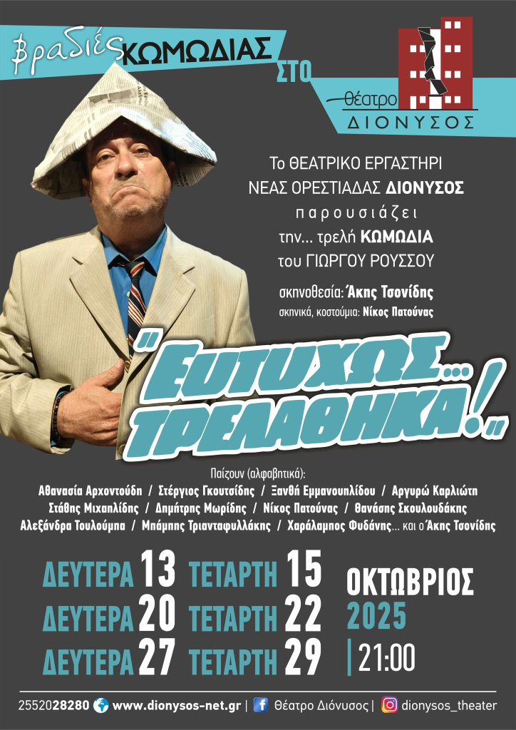 Το Θεατρικό Εργαστήρι Νέας Ορεστιάδας ΔΙΟΝΥΣΟΣ επιστρέφει δυναμικά στη σκηνή με την ξεκαρδιστική κωμωδία του Γιώργου Ρούσσου «Ευτυχώς… Τρελάθηκα!», σε σκηνοθεσία του Άκη Τσονίδη. Από τη Δευτέρα 13 Οκτωβρίου και για έξι παραστάσεις, το κοινό θα έχει την ευκαιρία να απολαύσει μια ανατρεπτική θεατρική εμπειρία γεμάτη γέλιο, απρόοπτα και… μια δόση τρέλας!