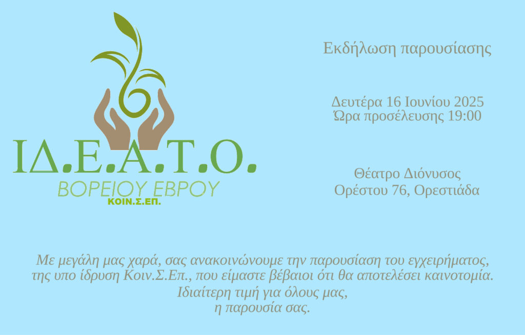 Εκδήλωση παρουσίασης του νεοσύστατου κοινωνικού εγχειρήματος με την ονομασία “ΙΔ.Ε.Α.Τ.Ο. ΒΟΡΕΙΟΥ ΕΒΡΟΥ” θα πραγματοποιηθεί την Δευτέρα 16 Ιουνίου 2025 και ώρα 19:00, στην Ορεστιάδα, στο Θέατρο Διόνυσος (Ορέστου 76) .