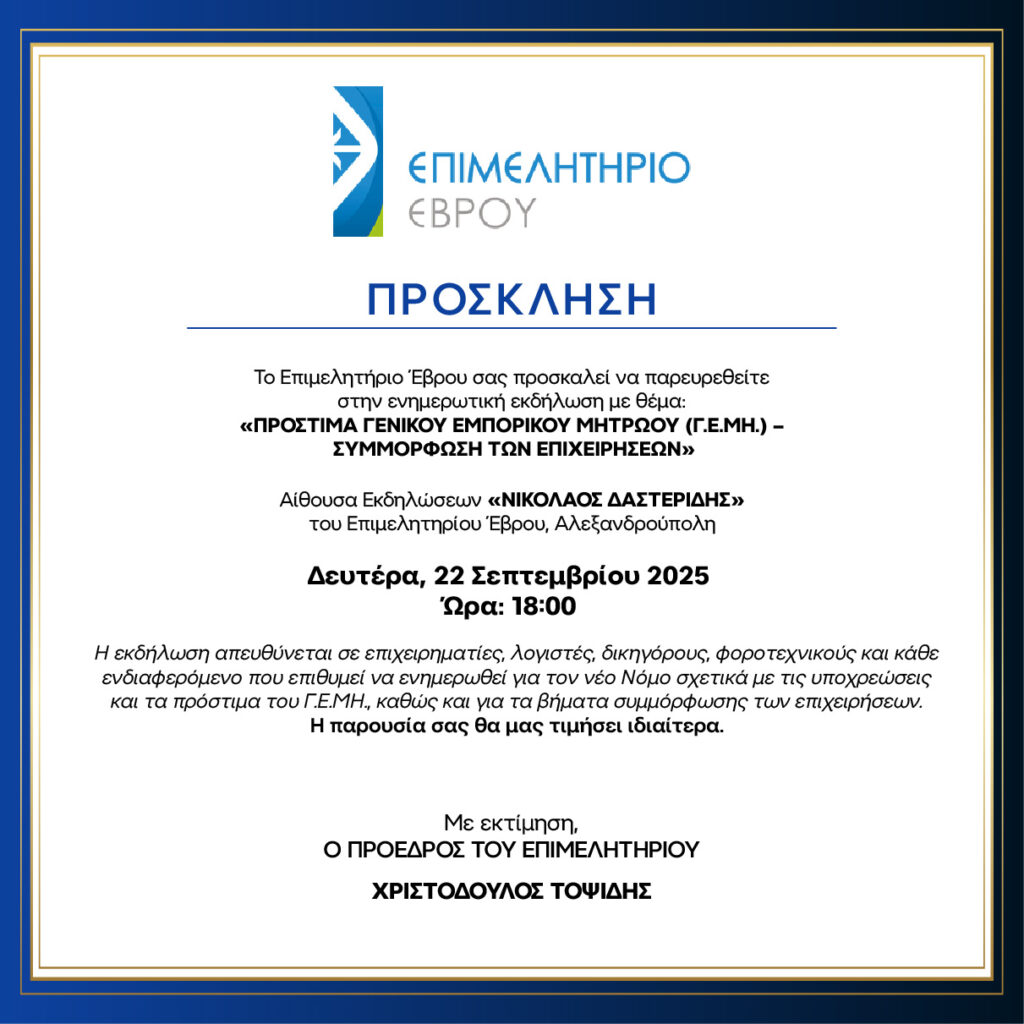 Το Επιμελητήριο Έβρου διοργανώνει ενημερωτική εκδήλωση με θέμα «Πρόστιμα Γενικού Εμπορικού Μητρώου (Γ.Ε.ΜΗ.) – Συμμόρφωση των Επιχειρήσεων», την Τετάρτη 1 Οκτωβρίου 2025, στις 18:00, στο ξενοδοχείο Βιέννη στην Ορεστιάδα.