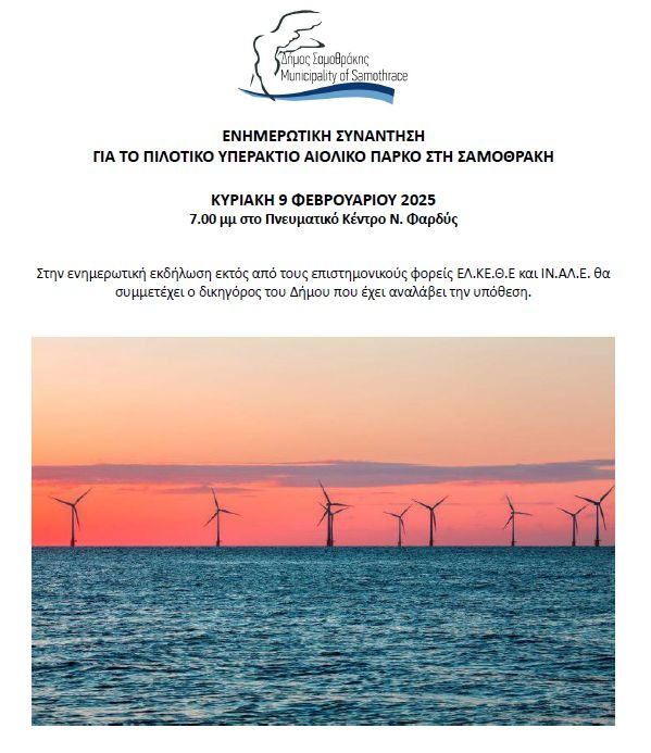 Μετά από απόφαση του Δημοτικού Συμβουλίου Σαμοθράκης, καλούνται όλοι φορείς, εργαζόμενοι, επαγγελματίες και πολίτες και όσοι επιθυμούν να συμμετέχουν στην ενημερωτική συνάντηση για το πιλοτικό υπεράκτιο αιολικό πάρκο την Κυριακή 9 Φεβρουαρίου στις 7.00 μμ στο Πνευματικό Κέντρο Ν. Φαρδύς.