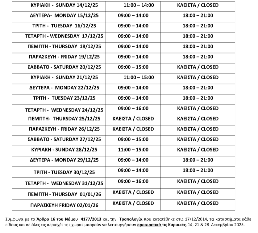 Το εορταστικό ωράριο λειτουργίας των εμπορικών καταστημάτων της Αλεξανδρούπολης για την περίοδο των Χριστουγέννων και της Πρωτοχρονιάς ανακοινώθηκε και θα ισχύσει από 14 Δεκεμβρίου 2025 έως και 2 Ιανουαρίου 2026.