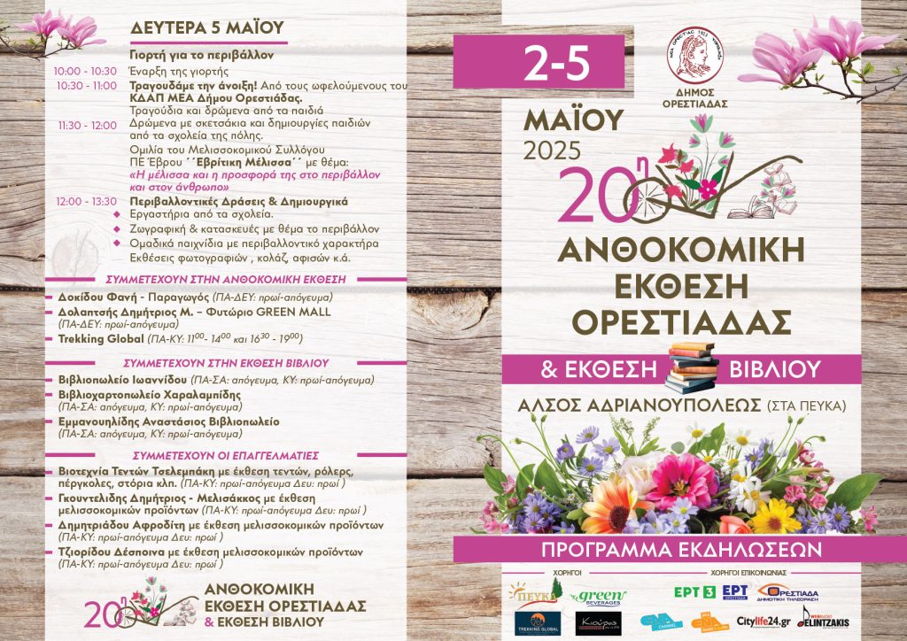 Ο Δήμος Ορεστιάδας σάς προσκαλεί στη 20η Ανθοκομική Έκθεση και έκθεση βιβλίου, η οποία θα πραγματοποιηθεί από 02 έως 05 Μαΐου 2025 στον πευκώνα της πόλης μας.