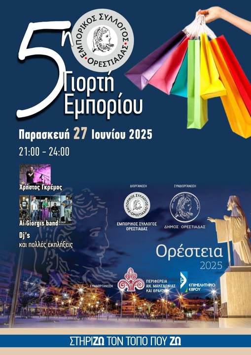 Ο Εμπορικός Σύλλογος Ορεστιάδας σε συνεργασία με τον Δήμο Ορεστιάδας, διοργανώνει την 5η Γιορτή Εμπορίου, την Παρασκευή 27 Ιουνίου 2025, με στόχο την τόνωση της τοπικής αγοράς και τη στήριξη των εμπορικών επιχειρήσεων της πόλης μας.