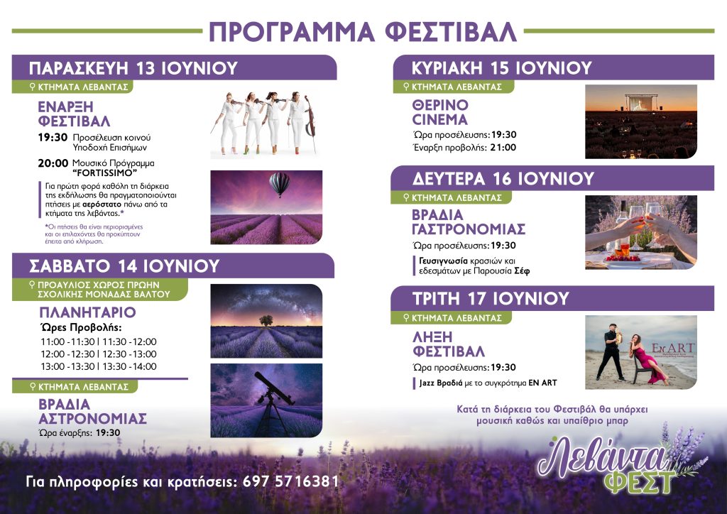 Οι προσκεκλημένοι θα έχουν την ευκαιρία να συμμετέχουν σε περιορισμένο αριθμό, σε μια γιορτή χρωμάτων και αρωμάτων. Ζωντανή τζαζ μουσική, τοπικός οίνος και παραδοσιακά εδέσματα, για πρώτη φορά βόλτα με το αερόστατο πάνω από τα κτήματα λεβάντας, βραδιά αστρονομίας, αλλά και σινεμά είναι αυτά που συνθέτουν το φετνό πρόγραμμα για τις τριήμερες εκδηλώσεις.