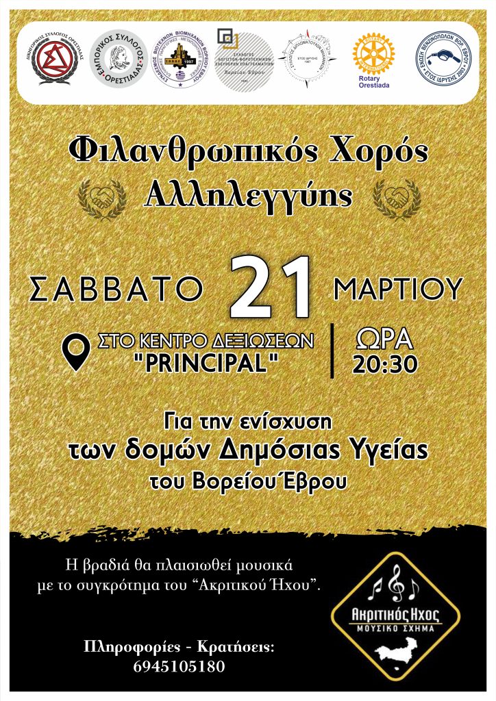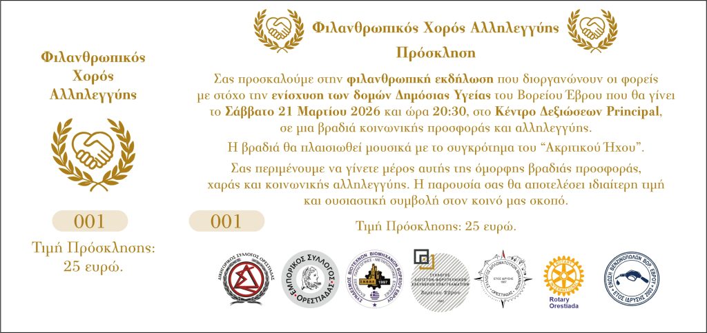 Η εκδήλωση έχει φιλανθρωπικό χαρακτήρα, με στόχο την ενίσχυση του Γενικό Νοσοκομείο Διδυμοτείχου και των Κέντρων Υγείας των Δήμων Ορεστιάδας και Διδυμότειχο, στηρίζοντας το σημαντικό έργο που προσφέρουν καθημερινά στις τοπικές κοινωνίες.