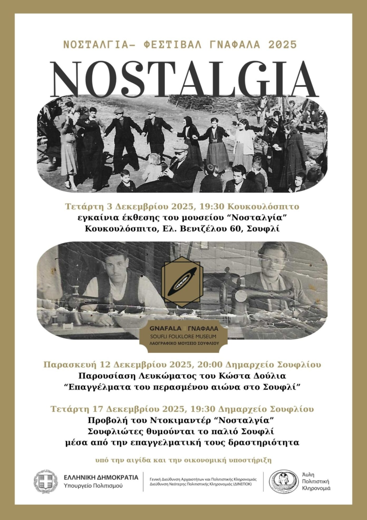 Το Λαογραφικό Μουσείο Σουφλίου «Γνάφαλα» ανακοίνωσε το πρόγραμμα εκδηλώσεων του Δεκεμβρίου στο πλαίσιο του φετινού φεστιβάλ «Γνάφαλα 2025 – Νοσταλγία», ενός θεματικού αφιερώματος που εστιάζει στη μνήμη, την καθημερινότητα και τα επαγγέλματα του Σουφλίου τον περασμένο αιώνα. Με μια σειρά από δράσεις που συνδυάζουν ιστορική έρευνα, προφορικές μαρτυρίες και καλλιτεχνική παρουσίαση, το φεστιβάλ επιχειρεί να αναδείξει την πλούσια πολιτιστική κληρονομιά της πόλης.
