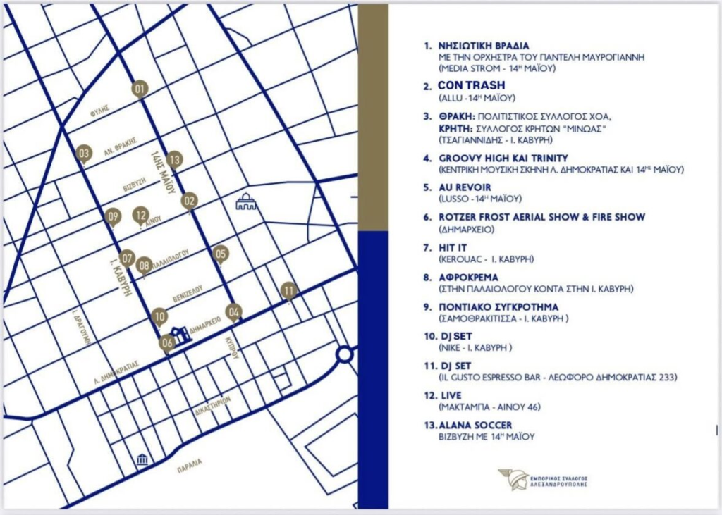 Συνολικά 13 μουσικές σκηνές θα στηθούν σε κεντρικά σημεία της πόλης, φιλοξενώντας τοπικές μπάντες από τη Θράκη και τη Βόρεια Ελλάδα. Οι επισκέπτες θα έχουν την ευκαιρία να απολαύσουν ένα ευρύ μουσικό φάσμα, από παραδοσιακά θρακιώτικα μέχρι σύγχρονες ελληνικές επιτυχίες.
