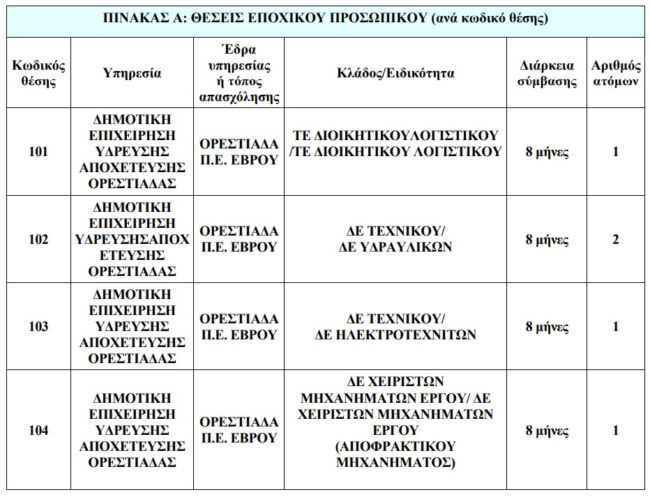 Η ΔΕΥΑ Ορεστιάδας ανακοίνωσε την πρόσληψη πέντε ατόμων για την κάλυψη εποχικών ή παροδικών αναγκών της, με διάρκεια σύμβασης 8 μηνών. Οι προσλήψεις αφορούν τέσσερις ειδικότητες και θα πραγματοποιηθούν μέσω του ΑΣΕΠ, σύμφωνα με την ισχύουσα νομοθεσία.