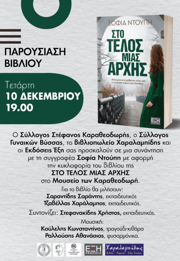 Με μια ζεστή και πολιτισμικά φορτισμένη εκδήλωση, η Νέα Βύσσα ετοιμάζεται να υποδεχθεί τη συγγραφέα Σοφία Ντούπη και το νέο της βιβλίο «Στο Τέλος Μιας Αρχής». Ο Πολιτιστικός Σύλλογος Νέας Βύσσας «Στέφανος Καραθεοδωρής», ο Σύλλογος Γυναικών Βύσσας, το Βιβλιοπωλείο Χαραλαμπίδης και οι Εκδόσεις Έξη συνδιοργανώνουν την παρουσίαση που θα πραγματοποιηθεί την Τετάρτη 10 Δεκεμβρίου 2025, στο ιστορικό Μουσείο των Καραθεοδωρή.