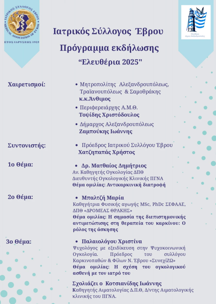 Ο Ιατρικός Σύλλογος Έβρου διοργανώνει στην Αλεξανδρούπολη επιστημονική εκδήλωση με θέμα: «Προλαμβάνεται ο καρκίνος;».