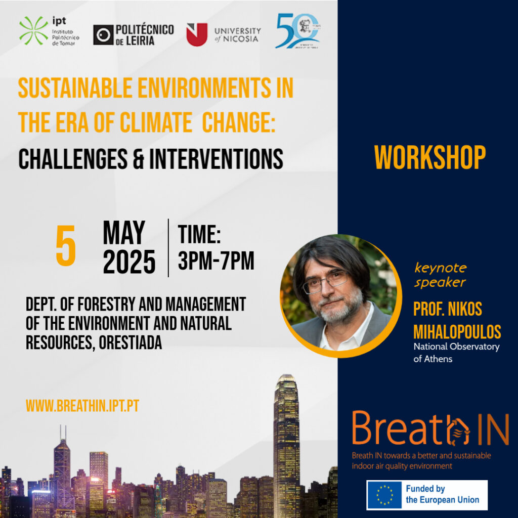 Η διοργάνωση γίνεται στα πλαίσια του προγράμματος Erasmus+ KA220 HED “BreathIN–Towardsabetterandsustainableindoorairqualityenvironment”, τη Δευτέρα 5/5/2025 και ώρα 15:00-19:00 στο αμφιθέατρο Κωνσταντίνος Σίδερης του Τμήματος με τίτλο “SustainableEnvironmentsintheEraofClimateChange: ChallengesandInterventions”.