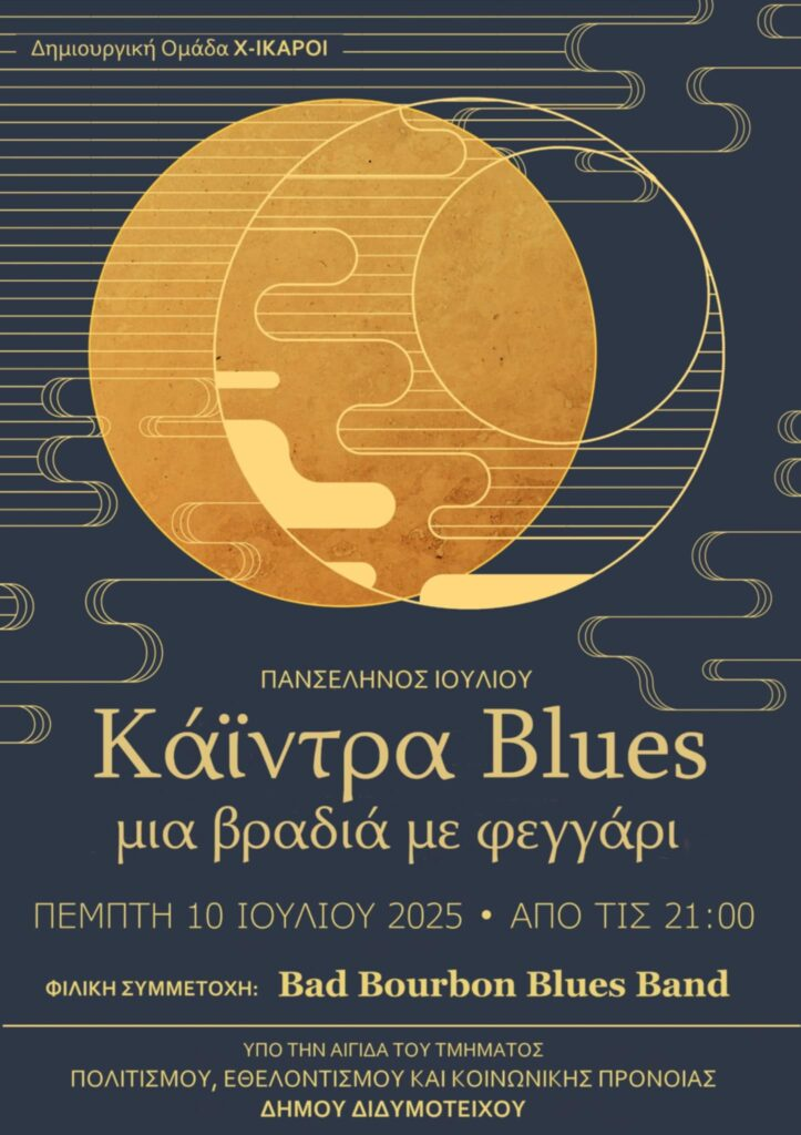 Κάιντρα Blues – Μια βραδιά με φεγγάρι την Πέμπτη 10 Ιουλίου 2025, στις 21:00, στην ειδυλλιακή τοποθεσία Κάιντρα, κάτω από το φως της πανσελήνου του Ιουλίου.