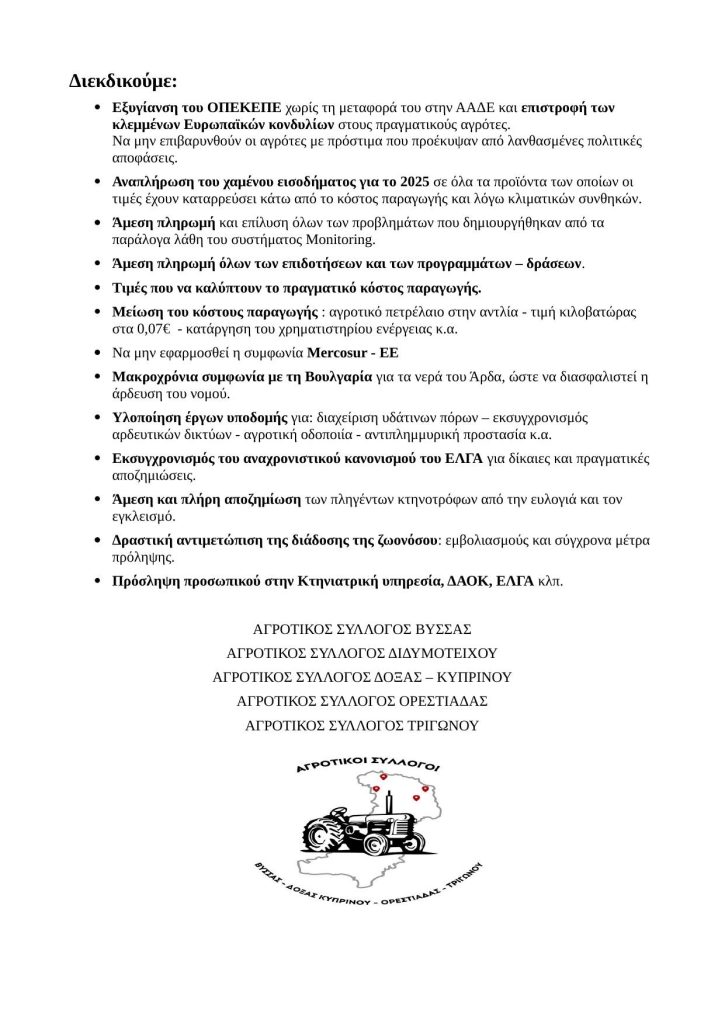 Οι σύλλογοι ζητούν την ακύρωση της συμφωνίας Mercosur – ΕΕ, την οποία θεωρούν απειλή για τα ευρωπαϊκά –και κατά συνέπεια ελληνικά– προϊόντα. Παράλληλα, θέτουν ως προτεραιότητα τη μακροχρόνια συμφωνία Ελλάδας – Βουλγαρίας για τα νερά του Άρδα, που αποτελεί ζωτικό ζήτημα για την άρδευση του νομού.