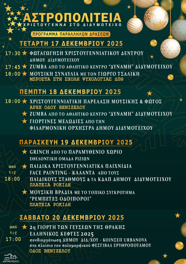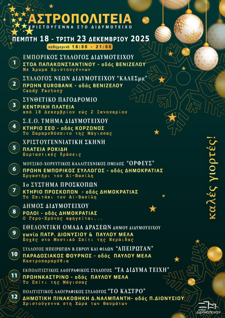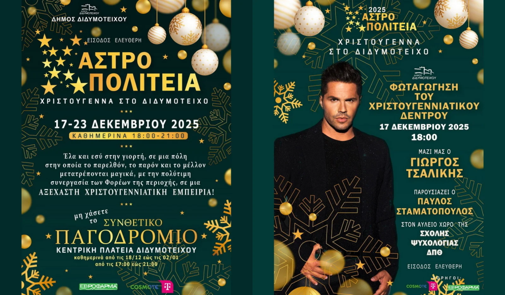 Σε χριστουγεννιάτικους ρυθμούς μπαίνει το Διδυμότειχο, καθώς ο Δήμος προσκαλεί μικρούς και μεγάλους στη φετινή τελετή φωταγώγησης του Χριστουγεννιάτικου Δέντρου, που θα πραγματοποιηθεί την Τετάρτη 17 Δεκεμβρίου 2025, στον στολισμένο χώρο μπροστά από το Τμήμα Ψυχολογίας του Δημοκριτείου Πανεπιστημίου Θράκης.