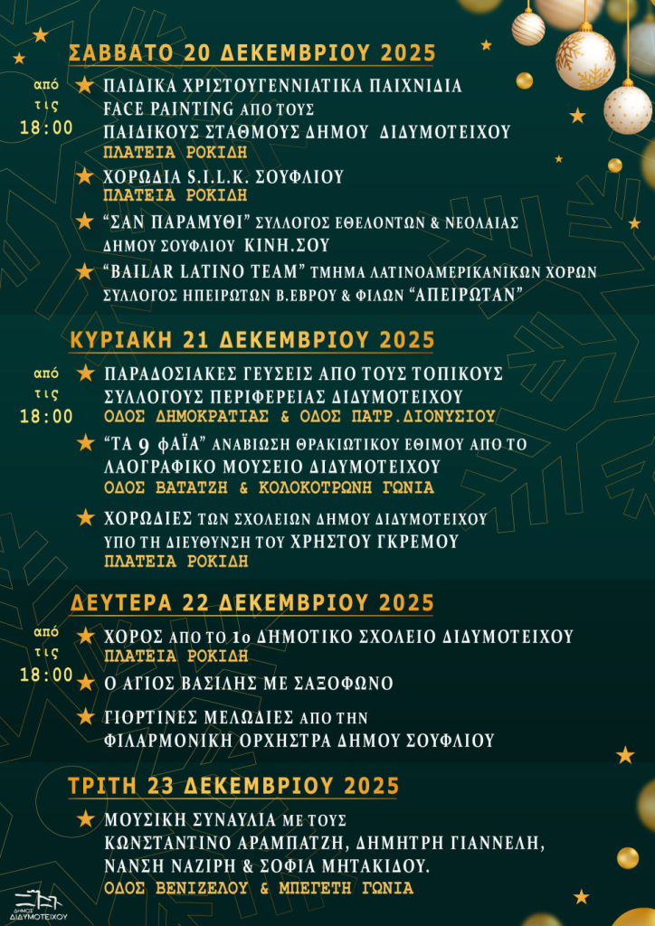Η είσοδος είναι ελεύθερη, με τον Δήμο Διδυμοτείχου να απευθύνει ανοιχτό κάλεσμα στους κατοίκους και τους επισκέπτες της περιοχής να συμμετάσχουν στη γιορτή και να μοιραστούν στιγμές χαράς, μουσικής και χριστουγεννιάτικης μαγείας, δίνοντας το έναυσμα για ένα φωτεινό και αισιόδοξο εορταστικό δεκαπενθήμερο.
