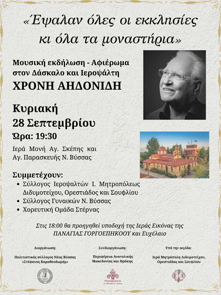Μια σημαντική μουσική εκδήλωση, αφιερωμένη στον αείμνηστο δάσκαλο της παραδοσιακής μουσικής και ιεροψάλτη Χρόνη Αηδονίδη, θα πραγματοποιηθεί την Κυριακή 28 Σεπτεμβρίου στη Νέα Βύσσα, στο πλαίσιο των εορταστικών εκδηλώσεων για την Αγία Σκέπη.