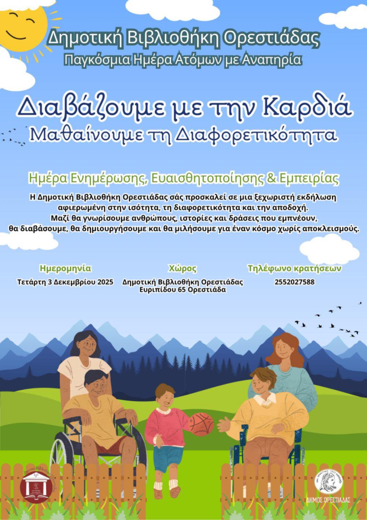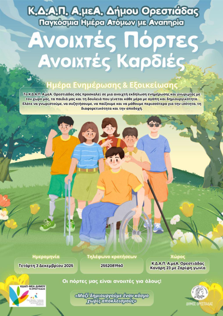Με αφορμή την Παγκόσμια Ημέρα Ατόμων με Αναπηρία, που τιμάται κάθε χρόνο στις 3 Δεκεμβρίου, ο Δήμος Ορεστιάδας ανακοινώνει την υλοποίηση μίας σειράς δράσεων με στόχο την ενημέρωση, την ευαισθητοποίηση και την ενίσχυση της κοινωνικής ένταξης των ατόμων με αναπηρία στην τοπική κοινωνία.