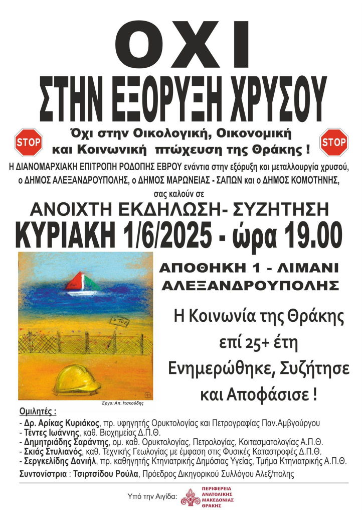 Έτσι, η Διανομαρχιακή Επιτροπή Έβρου- Ροδόπης προσκαλεί όλους τους πολίτες του Έβρου και της Ροδόπης να πλαισιώσουν και να στηρίξουν και πάλι με όλες τις δυνάμεις την εκδήλωση που διοργανώνει την Κυριακή 1 Ιουνίου 2025 και ώρα 19:00 στην Αποθήκη 1 στο λιμάνι της Αλεξανδρούπολης, ώτσε να αποκρούσουμε και πάλι τα σχέδια των αποικιοκρατών χρυσοθήρων.