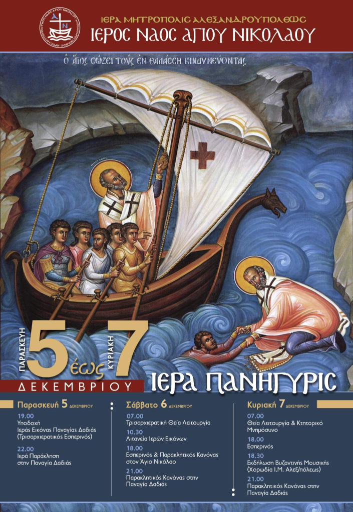 Η Ιερά Μητρόπολη Αλεξανδρουπόλεως απευθύνει πρόσκληση προς όλους τους πιστούς να συνεορτάσουν στην Εκκλησιαστική Πανήγυρη του προστάτη και πολιούχου Αγίου Νικολάου.
