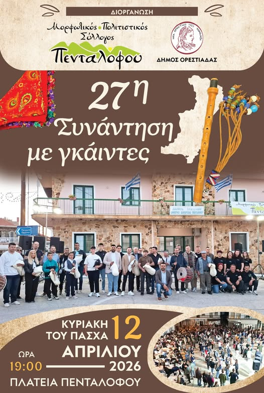 Σε μια βραδιά γεμάτη παράδοση και μουσική, ο Δήμος Ορεστιάδας και ο Μορφωτικός Πολιτιστικός Σύλλογος Πενταλόφου προσκαλούν το κοινό στην 27η Συνάντηση με γκάιντες, που θα πραγματοποιηθεί την Κυριακή του Πάσχα, 12 Απριλίου, στις 19:00, στην πλατεία του Πεντάλοφος.