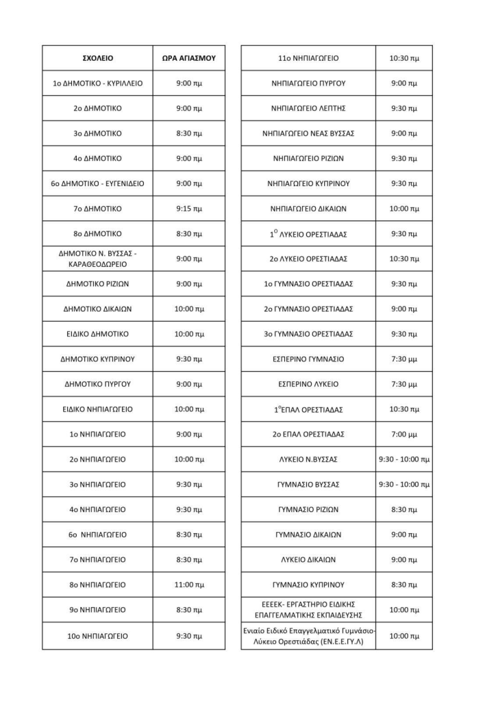 Όλες οι ώρες για Δημοτικά, Νηπιαγωγεία, Γυμνάσια και Λύκεια – Αναλυτικός πίνακας
