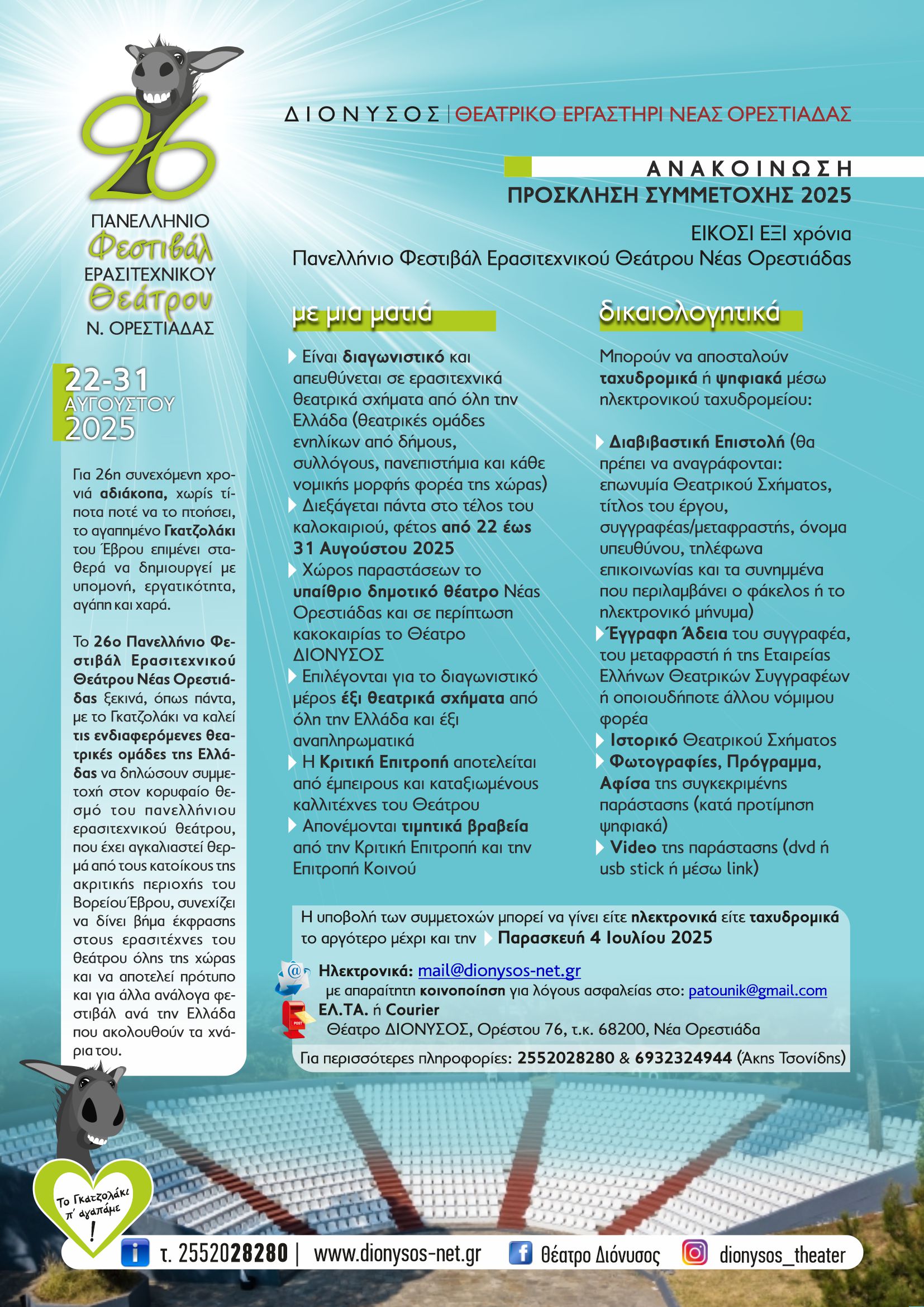 • Χώρος παραστάσεων το υπαίθριο δημοτικό θέατρο Νέας Ορεστιάδας και σε περίπτωση κακοκαιρίας το Θέατρο ΔΙΟΝΥΣΟΣ