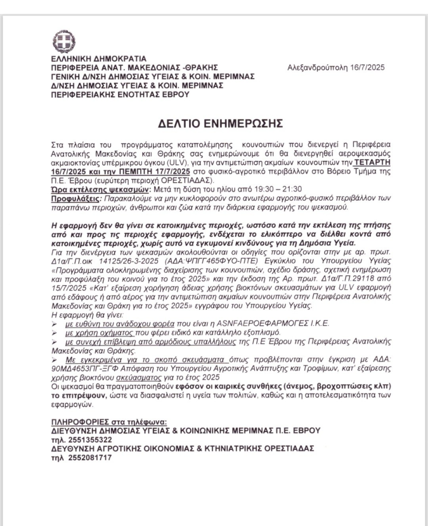 Στο πλαίσιο της προσπάθειας για την προστασία της δημόσιας υγείας και τον περιορισμό της όχλησης από τα κουνούπια, η Περιφέρεια Ανατολικής Μακεδονίας και Θράκης ανακοινώνει την πραγματοποίηση οργανωμένων αεροψεκασμών σε επιλεγμένες περιοχές του Έβρου. Οι ψεκασμοί εντάσσονται στο ολοκληρωμένο πρόγραμμα καταπολέμησης κουνουπιών και αφορούν κατά κύριο λόγο το αγροτικό και φυσικό περιβάλλον, με στόχο τον έλεγχο του πληθυσμού των ακμαίων εντόμων.