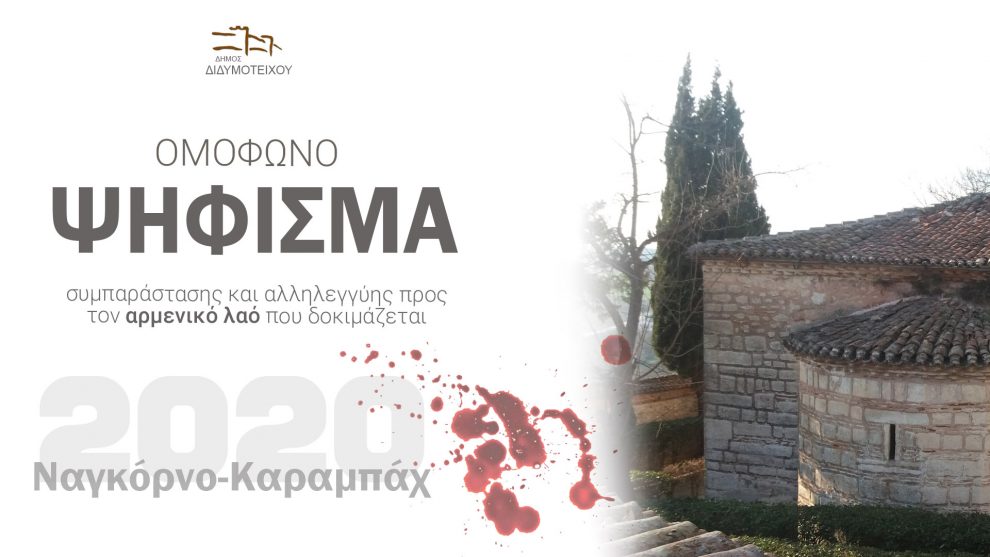 Σύσσωμο το Δημοτικό Συμβούλιο του Διδυμοτείχου, κατά την συνεδρίαση της 26ης Οκτωβρίου, λαμβάνοντας υπόψιν τον ρόλο της αρμένικης κοινότητας στον Δήμο, εξέδωσε ομόφωνο ψήφισμα, με το οποίο καταγγέλλει τη στρατιωτική εισβολή στο Αρτσάχ (Ναγκόρνο Καραμπάχ) και δηλώνει την συμπαράσταση και αλληλεγγύη του, προς τον αδελφό αρμενικό λαό που δοκιμάζεται.