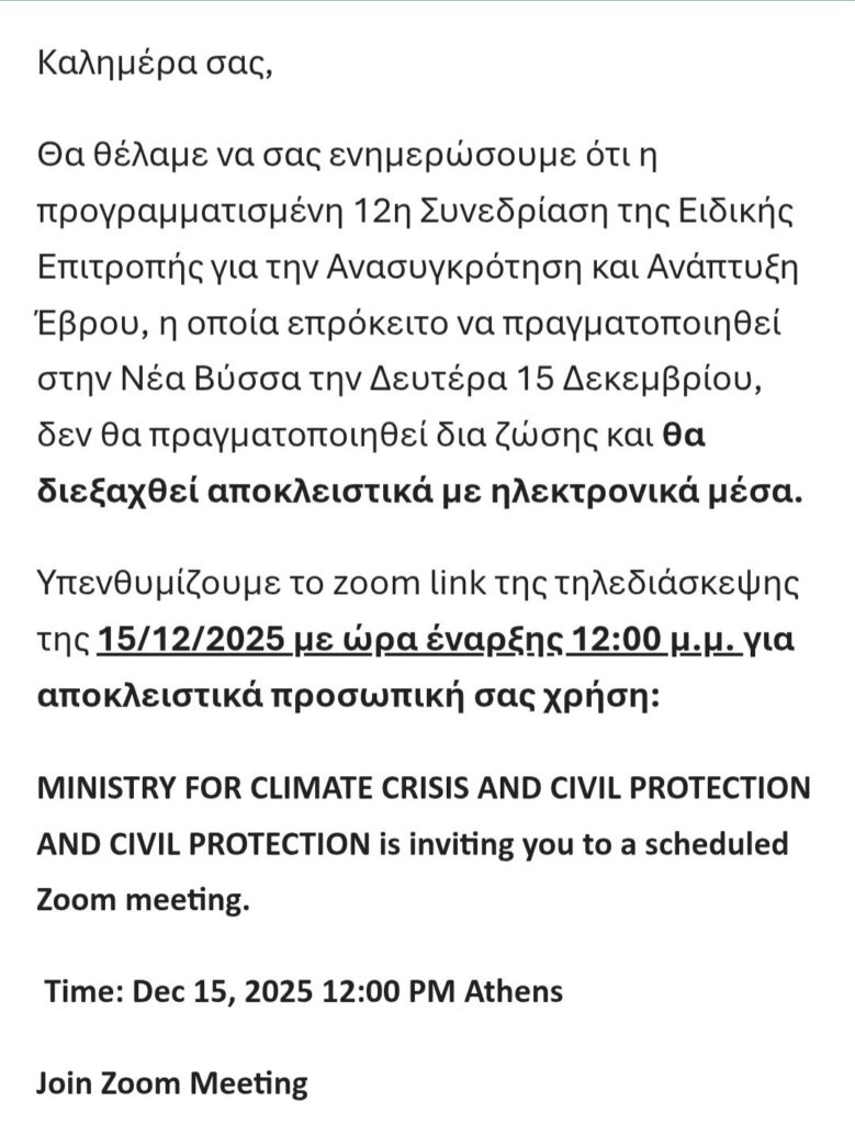 Τα αγροτικά μπλόκα σε κομβικά σημεία του Έβρου, αλλά και οι δυσκολίες μετακίνησης προς τη Νέα Βύσσα, φαίνεται πως κατέστησαν ανέφικτη τη φυσική παρουσία αρκετών συμμετεχόντων. Υπό αυτές τις συνθήκες, οι διοργανωτές οδηγήθηκαν στην επιλογή της τηλεδιάσκεψης, προκειμένου να αποφευχθούν ακυρώσεις ή καθυστερήσεις στη συνεδρίαση.