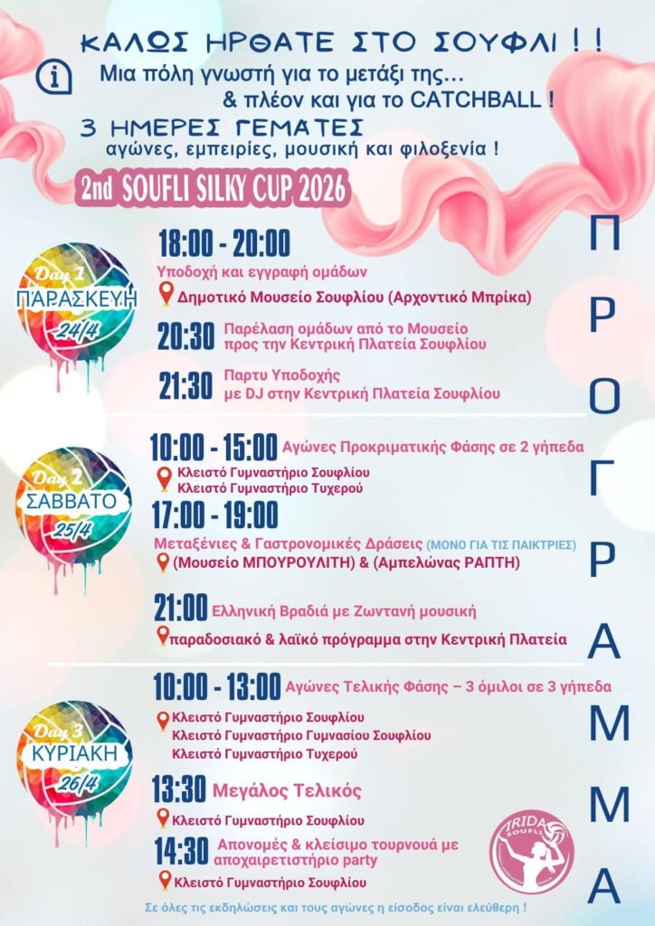 Αθλητές, προπονητές και φίλοι του αθλητισμού δίνουν ραντεβού στο Σουφλί από τις 24 έως τις 26 Απριλίου 2026, καθώς η πόλη φιλοξενεί για δεύτερη συνεχόμενη χρονιά το διεθνές τουρνουά «Soufli Silk Cup 2026», μια διοργάνωση που εξελίσσεται σε θεσμό για την περιοχή.