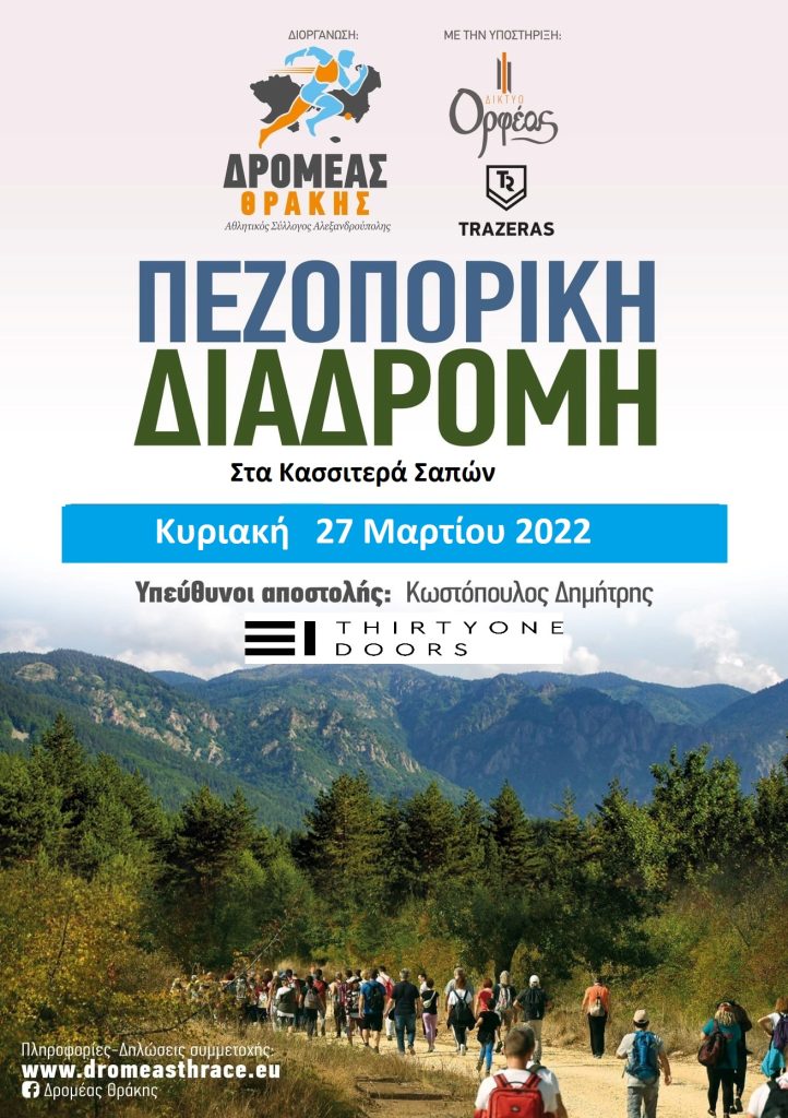 Μια νέα πεζοπορική πρόκληση είναι μπροστά μας. Την Κυριακή στις 27 Μαρτίου 2022 θα πεζοπορήσουμε στα Κασσιτερά Σαπών σε μια μαγευτική δασική διαδρομή με μοναδική πανοραμική θέα τον κάμπο της Ροδόπης την Κίρκη και τη Συκοράχη. Τα Κασσιτερά είναι ένα ποντιακό χωριό με υψόμετρο 330 μέτρα που το 1928 είχε 361 κατοίκους το 1940 είχε […]